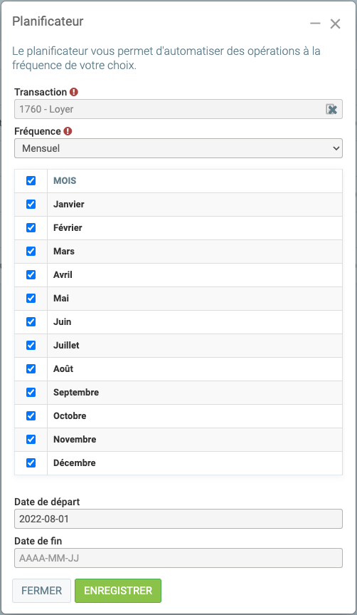 Pas besoin nécessaire de spécifier une date de fin, mais dans ce cas-ci vous pourriez spécifier la fin de votre bail. Cliquez sur enregistrer pour l'activer.
