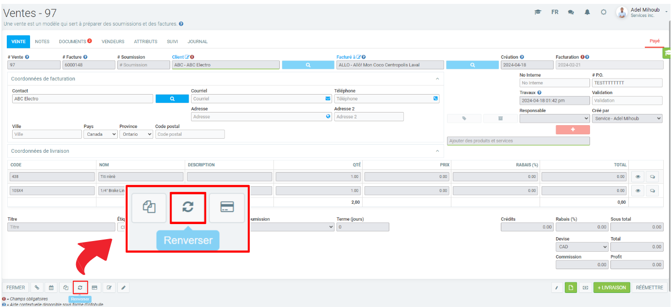 Une fois que vous avez votre vente à l'écran, localisez le bouton Renverser avec le signe de recyclage. On retrouve ce bouton dans cette série que vous retrouverez en bas, à gauche de l'écran.