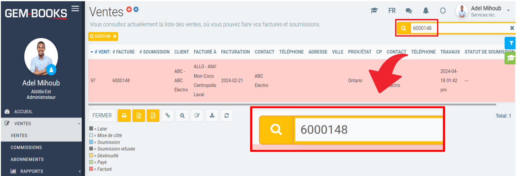 Si vous ne voyez pas le numéro de votre facture à inverser à l'écran et que vous souhaitez ne pas avoir à dérouler des pages et des pages pour retrouver la vente à partir de laquelle cette facture à renverser a été créée, la méthode alternative est d'effectuer une recherche à partir du numéro de la facture à renverser.