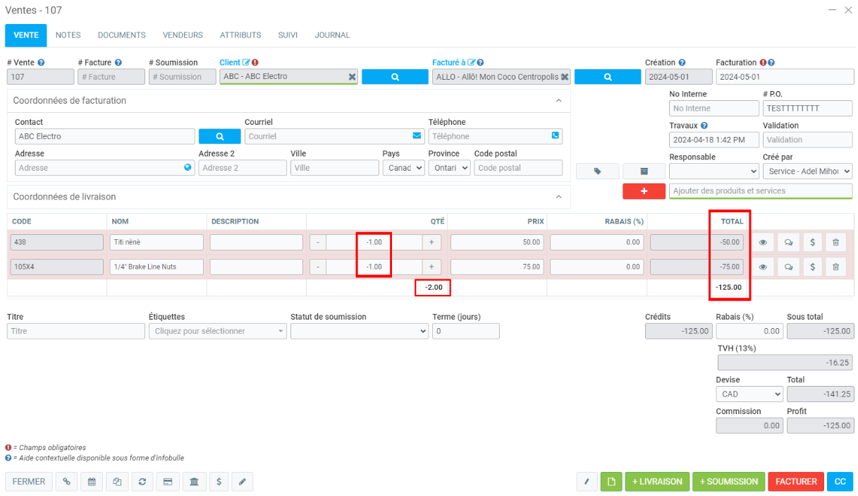 Tous les montants facturables figurant sur cette vente seront également en négatifs, de même que le sous-total, les taxes applicables et le total.