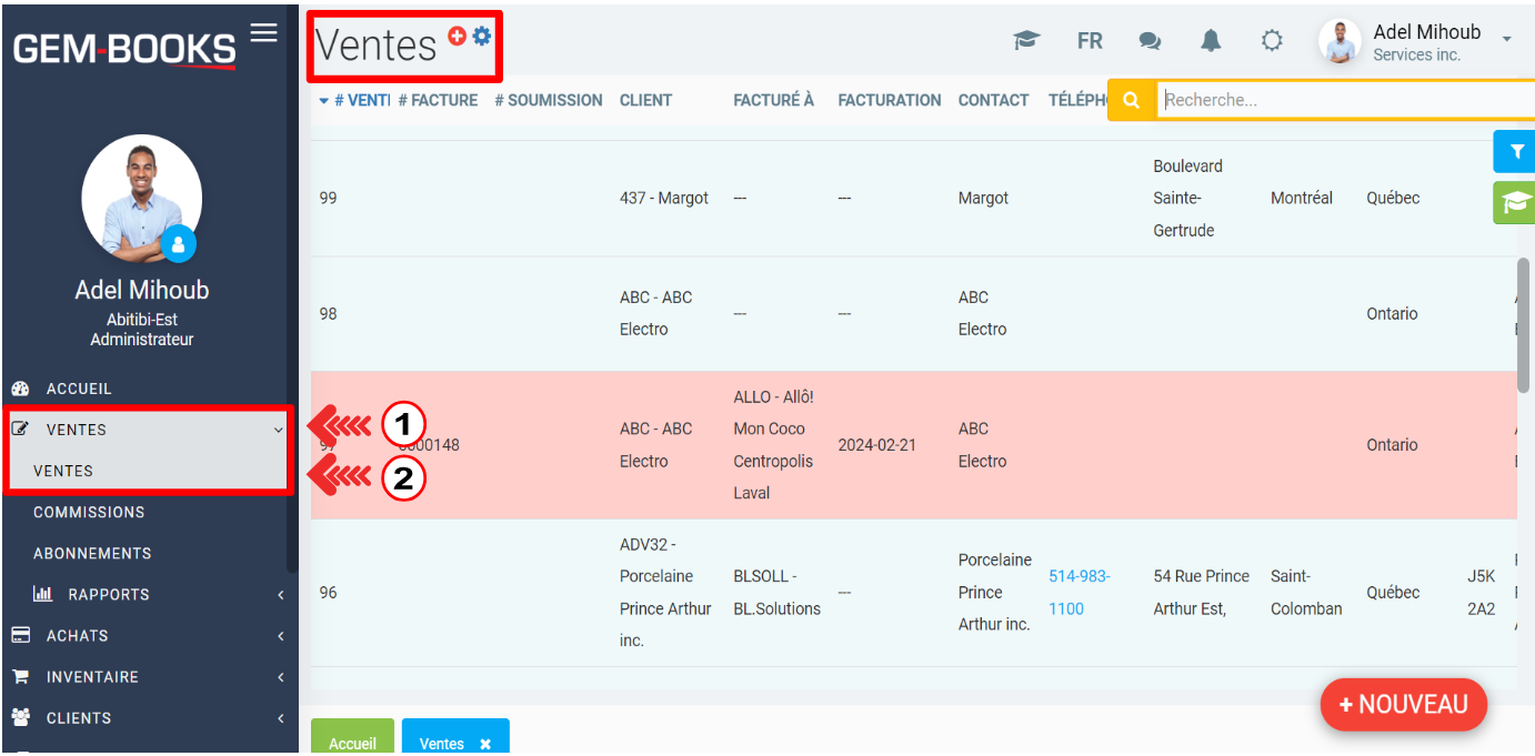 Dans le Menu principal situé à gauche de l'application, cliquez sur Ventes > Ventes pour afficher la liste des Ventes.