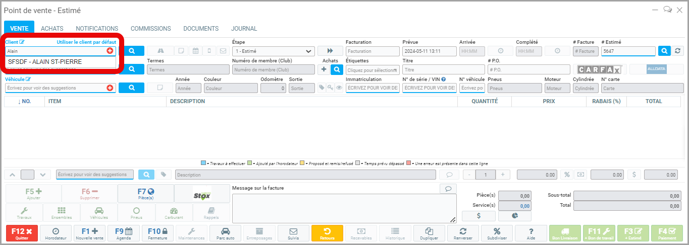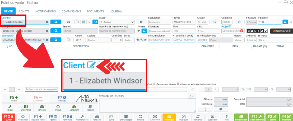 Notez que lorsque vous avez déjà sélectionné un client et que vous souhaitez apporter des modifications à son dossier, par exemple changer son numéro de téléphone, il suffit de cliquer sur Client, indiqué en bleu au dessus de la boite de texte.