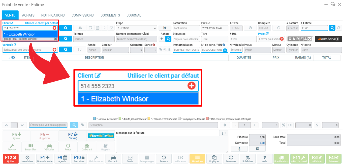 Depuis le Point de vente, tapez le numéro de téléphone ou le nom du client dans le champ Client et appuyez sur Entrée.
