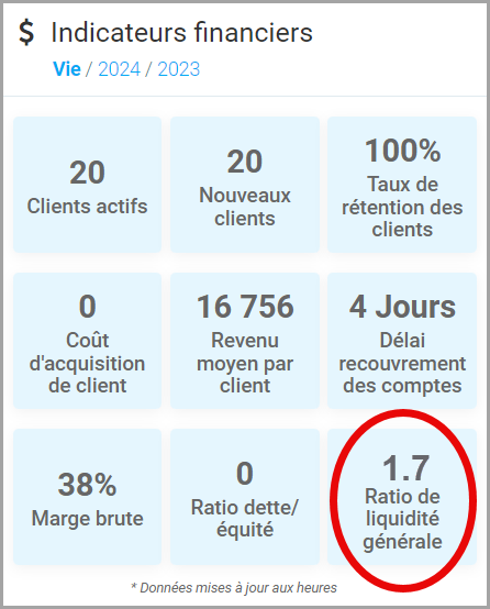 Le ratio de liquidité générale permet de savoir si l'entreprise a des liquidités suffisantes pour s'acquitter de ses obligations à court terme. Il devrait, selon les experts, être calculé plus d'une fois par année afin d'éviter de découvrir des problèmes alors qu'il est devenu trop tard pour y remédier. Le calcul de ce ratio permet également de savoir si l'entreprise dispose de fonds suffisants pour saisir de nouvelles occasions d'affaires et obtenir de meilleures occasions de CRÉDIT.