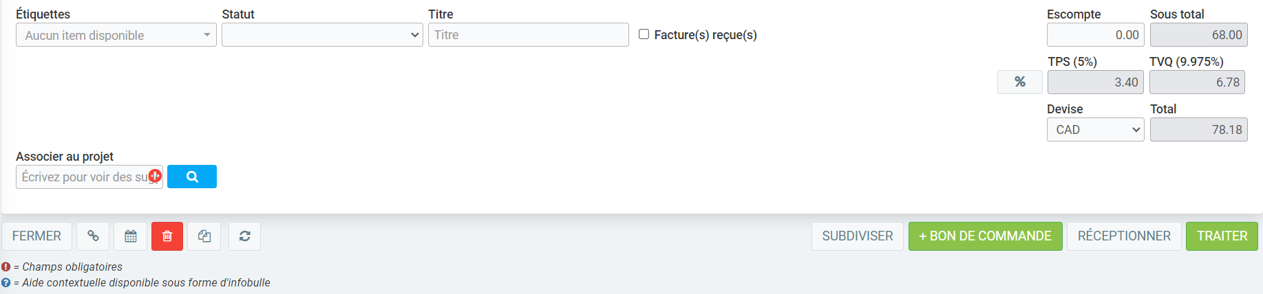 En bas de la page, à droite, vous trouverez les montants avec les taxes et les boutons suivants: