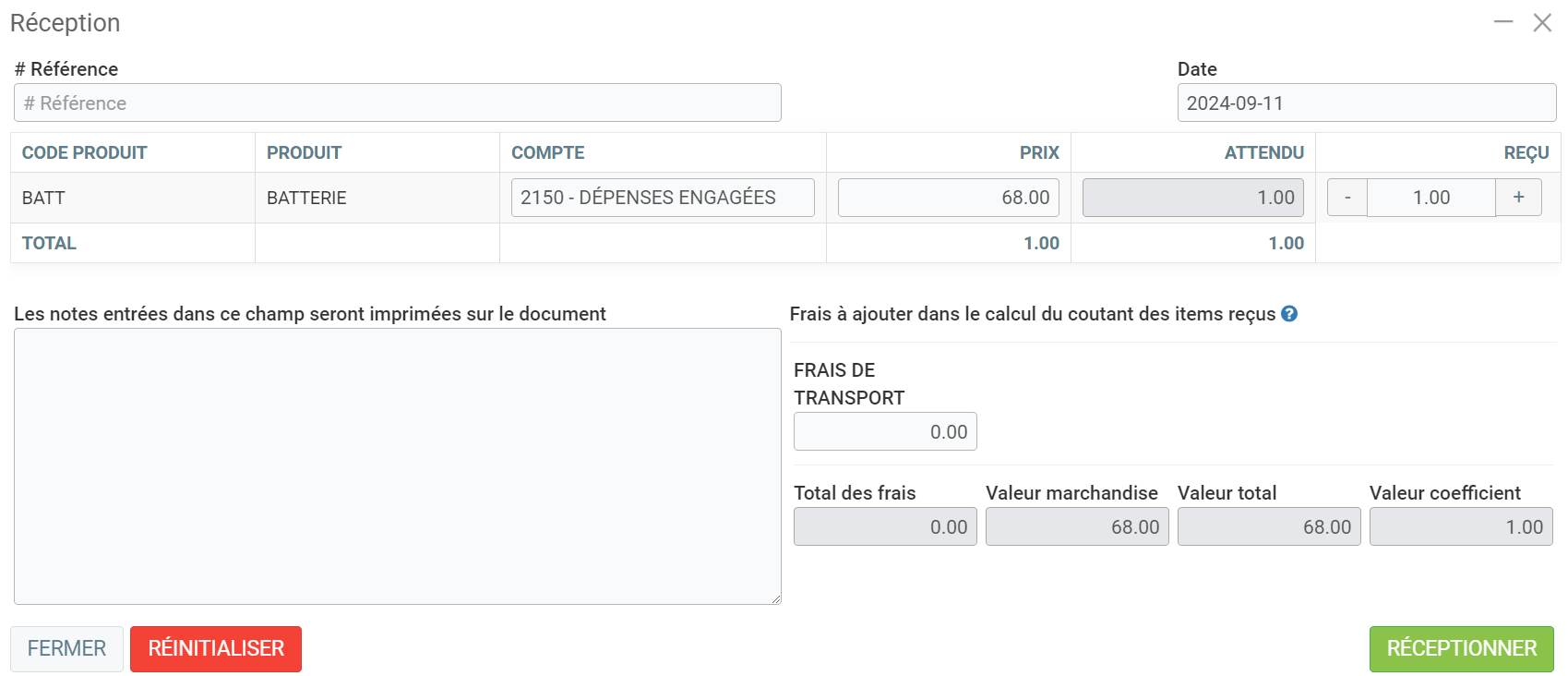 Si vous cliquez sur le bouton Réceptionner, une autre fenêtre s'ouvre. Elle contient les informations suivantes: