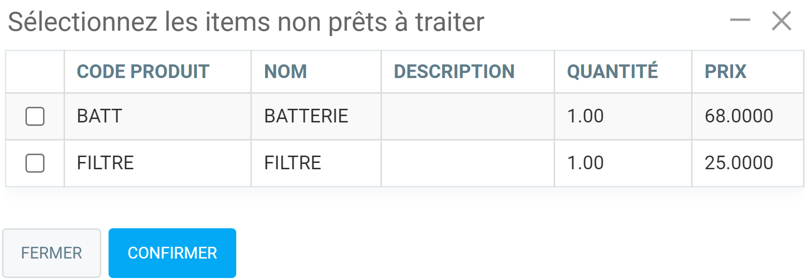 Si vous cliquez sur le bouton Subdiviser, une fenêtre s'ouvre pour indiquer le(s) produit(s) qui n'est (ne sont) pas prêt(s) à être traité(s).