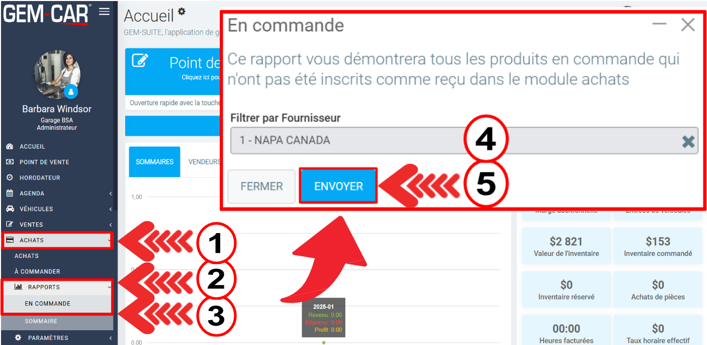 Pour générer des rapports sur les achats, cliquez sur Achats > Rapports > En commande > Filtrer par Fournisseur > Envoyer.