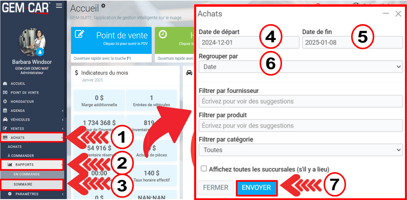Le deuxième type de rapport est le résumé. Pour le générer, cliquez sur Achats > Rapports > Sommaire.