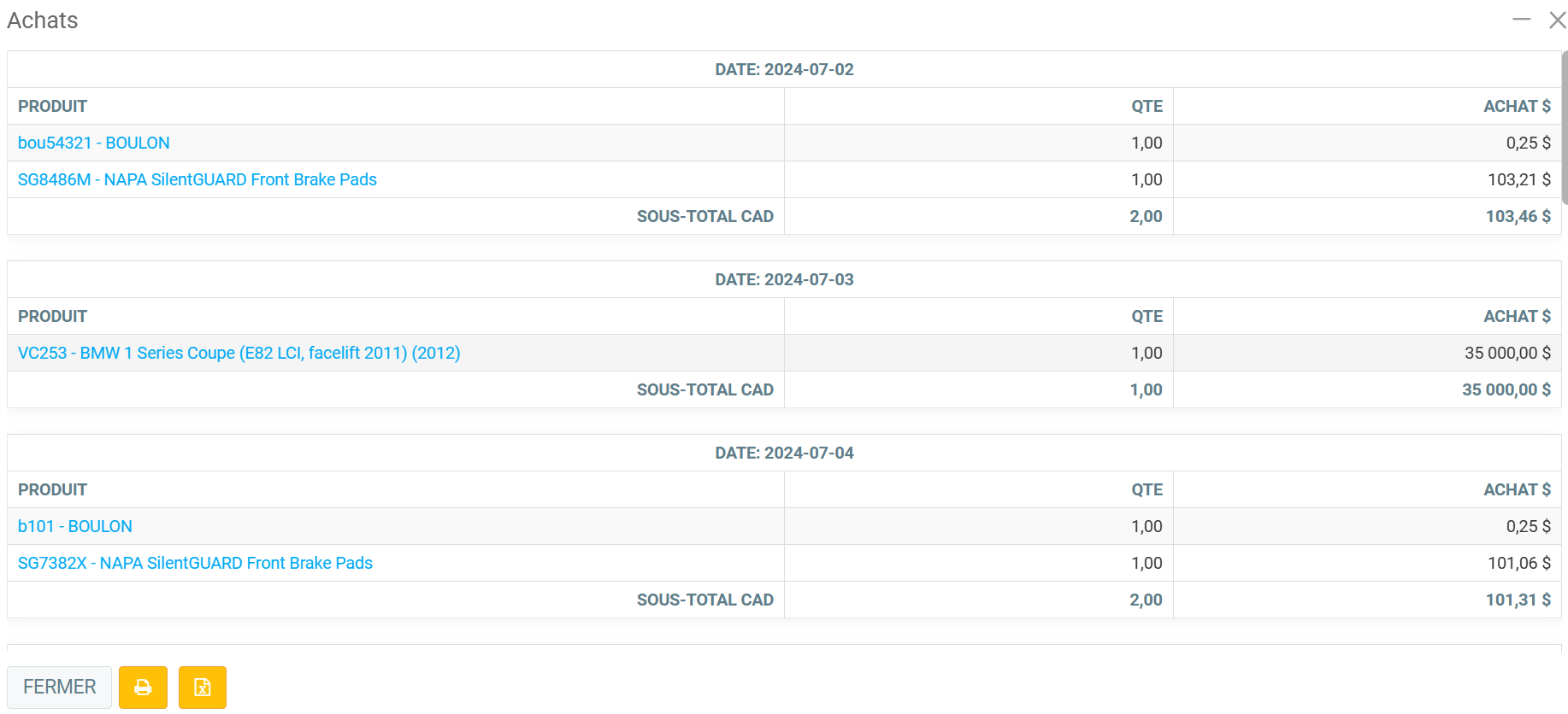 Sur la page suivante, vous verrez une liste des produits commandés aux dates sélectionnées et le montant total dépensé pour chaque achat.