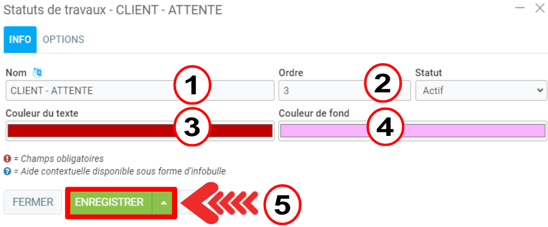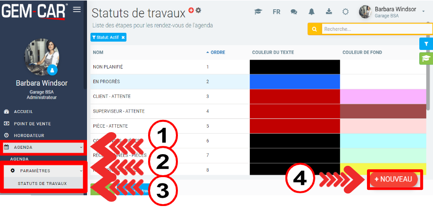 Pour ce faire suivez les étapes suivantes: allez dans le menu Agenda > Paramètres > Statuts de travaux > +Nouveau.