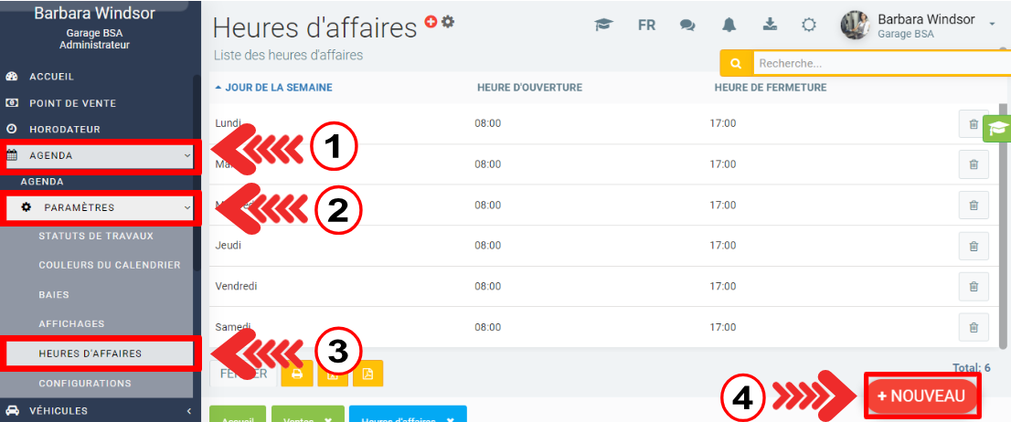 Allez dans le menu de gauche et cliquez sur Agenda > Paramètres > Heures d'affaires > +Nouveau.