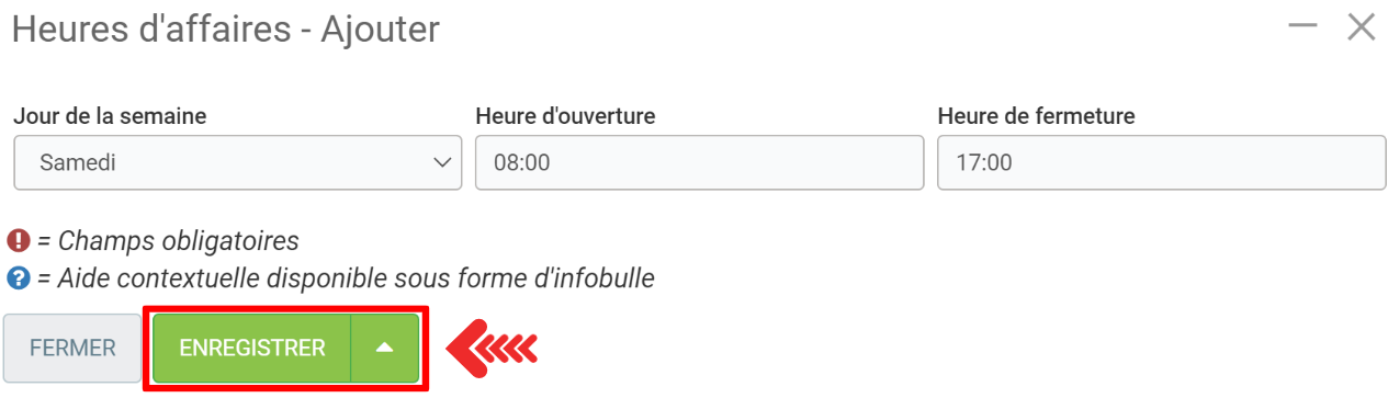 Dans la fenêtre suivante, vous pouvez sélectionner le jour de la semaine et les heures d'ouverture et de fermeture.