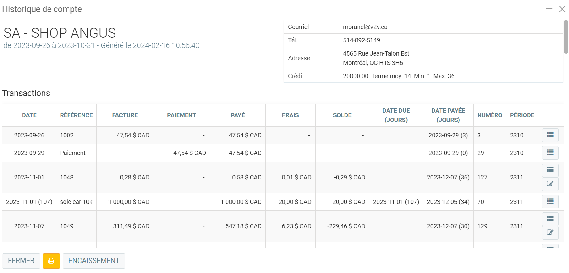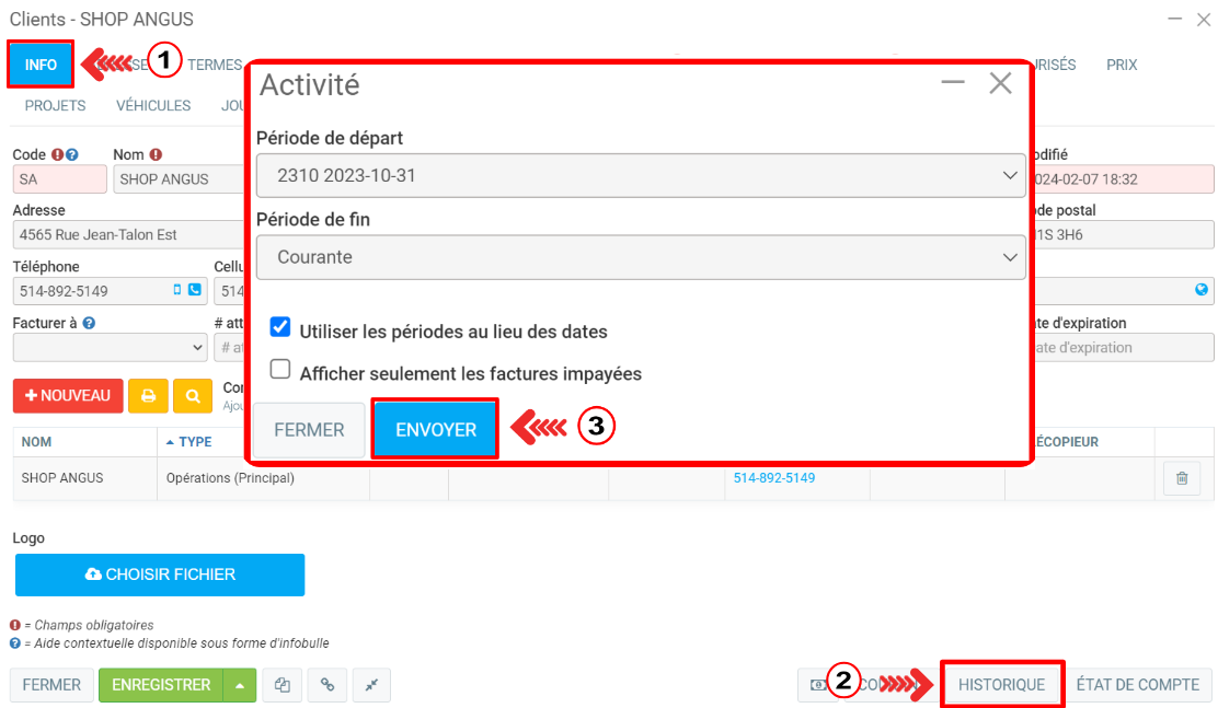 Choisissez le client dont vous souhaitez consulter l'historique et, dans l'onglet Info, sélectionnez le bouton Historique dans le coin droit de l'onglet.