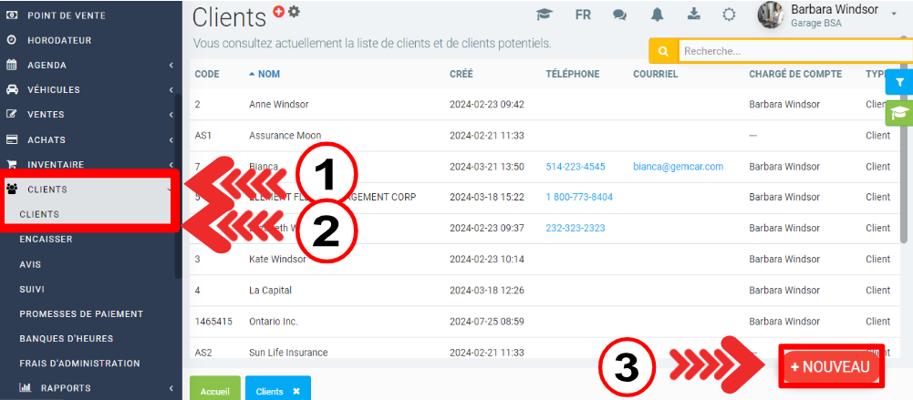Pour créer un client, cliquez sur le menu de gauche: Clients > Clients > +Nouveau.