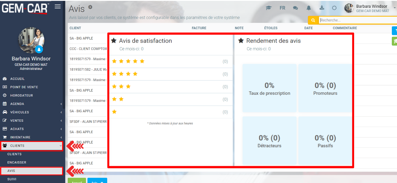 Cliquez sur Clients > Avis ou sur le tableau de bord 'Avis de satisfaction' et 'Rendement des avis'.