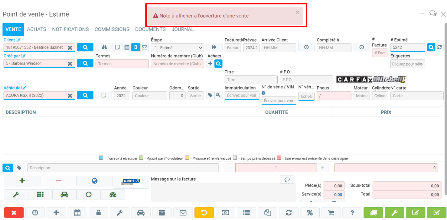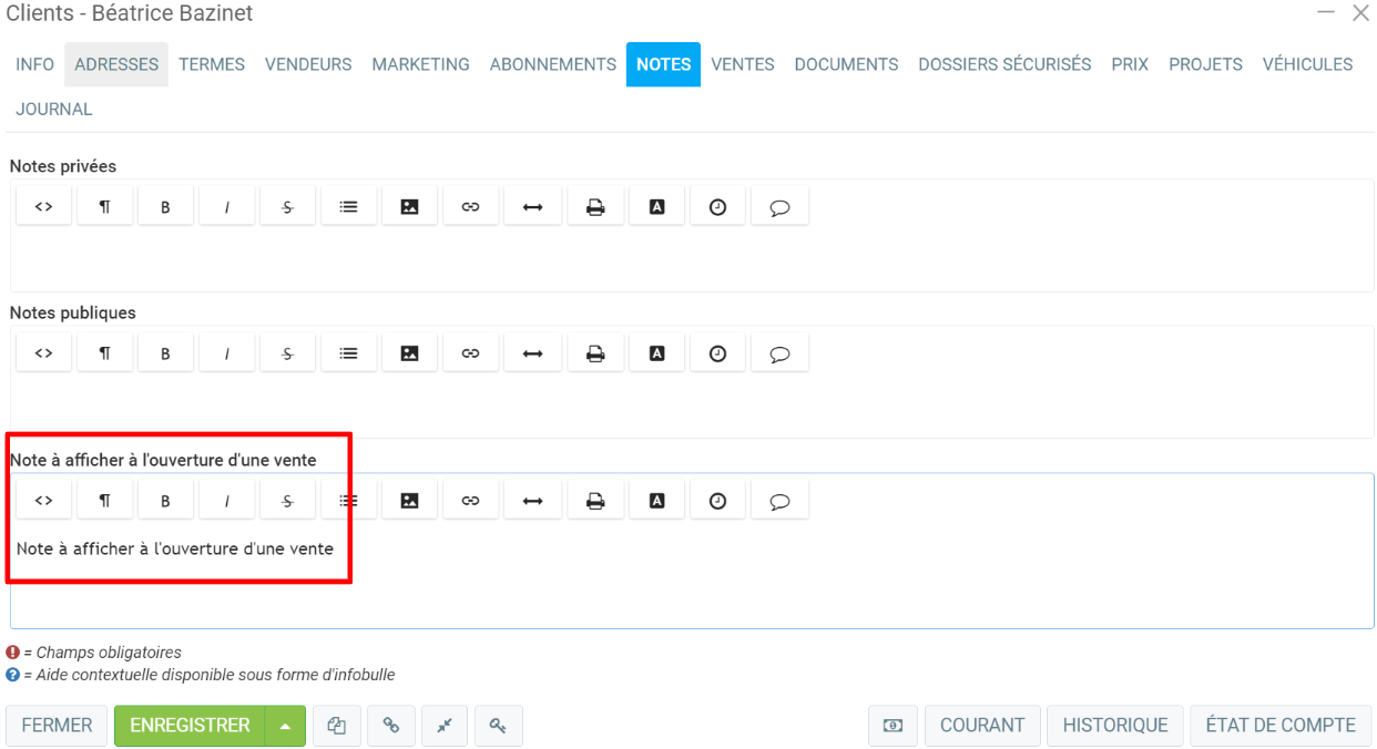La note à afficher lors de l'ouverture d'une vente est particulièrement intéressante car elle peut attirer votre attention sur quelque chose dès que vous ouvrez la vente pour un client grâce à un avertissement en rouge.