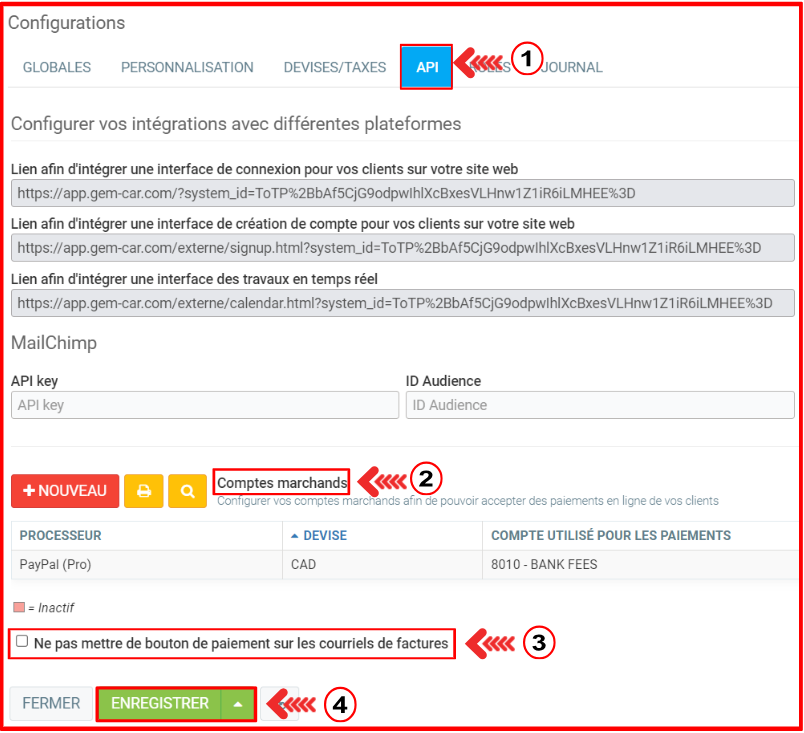 GEM-CAR offre la possibilité d'envoyer le lien vers la facture par courriel pour permettre au client de payer en ligne.