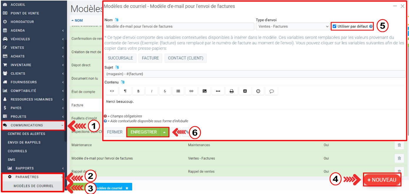 Cliquez sur Communications > Paramètres > Modèles de courriel.
