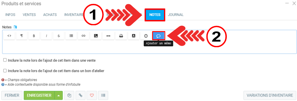 - ajouter la note dans le champ Notes et cocher la case "Inclure la note lors de l'ajout de cet item dans une vente"