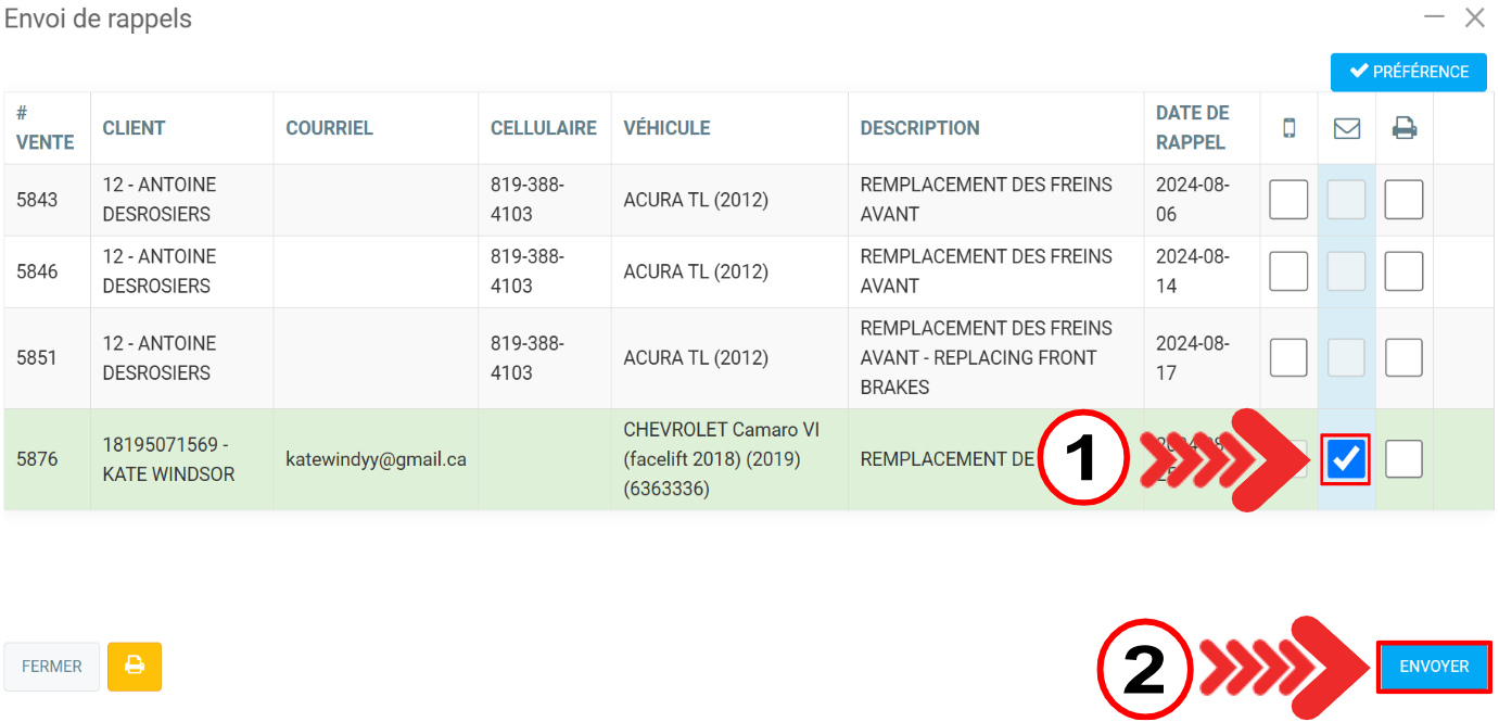 Envoyer les rappels au client