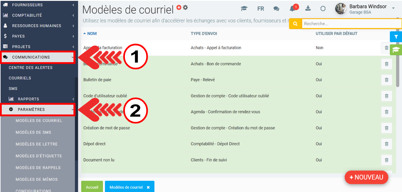 Pour créer ou consulter les modèles de lettres, courriels et/ou rappels, allez dans le menu de gauche Communications > Paramètres.