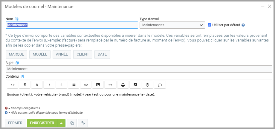 Bonjour {client}, votre véhicule {brand} {model} {year} est du pour une maintenance le {date}.