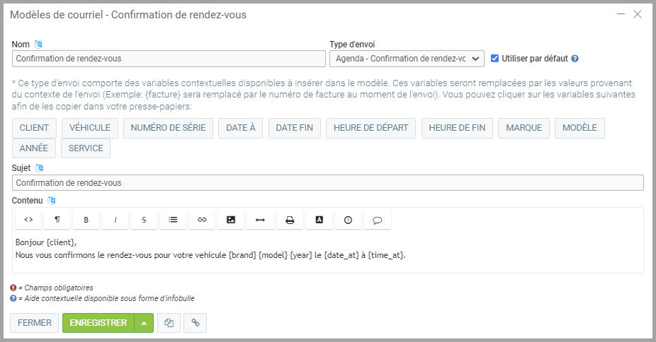 Nous vous confirmons le rendez-vous pour votre véhicule {brand} {model} {year} le {date_at} à {time_at}.