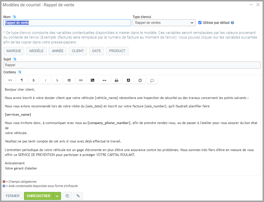 Nous vous invitons donc, à communiquer avec nous au {company_phone_number}, afin de prendre rendez-vous, ou de passer à l'atelier pour vous assurer du bon état de votre véhicule.
