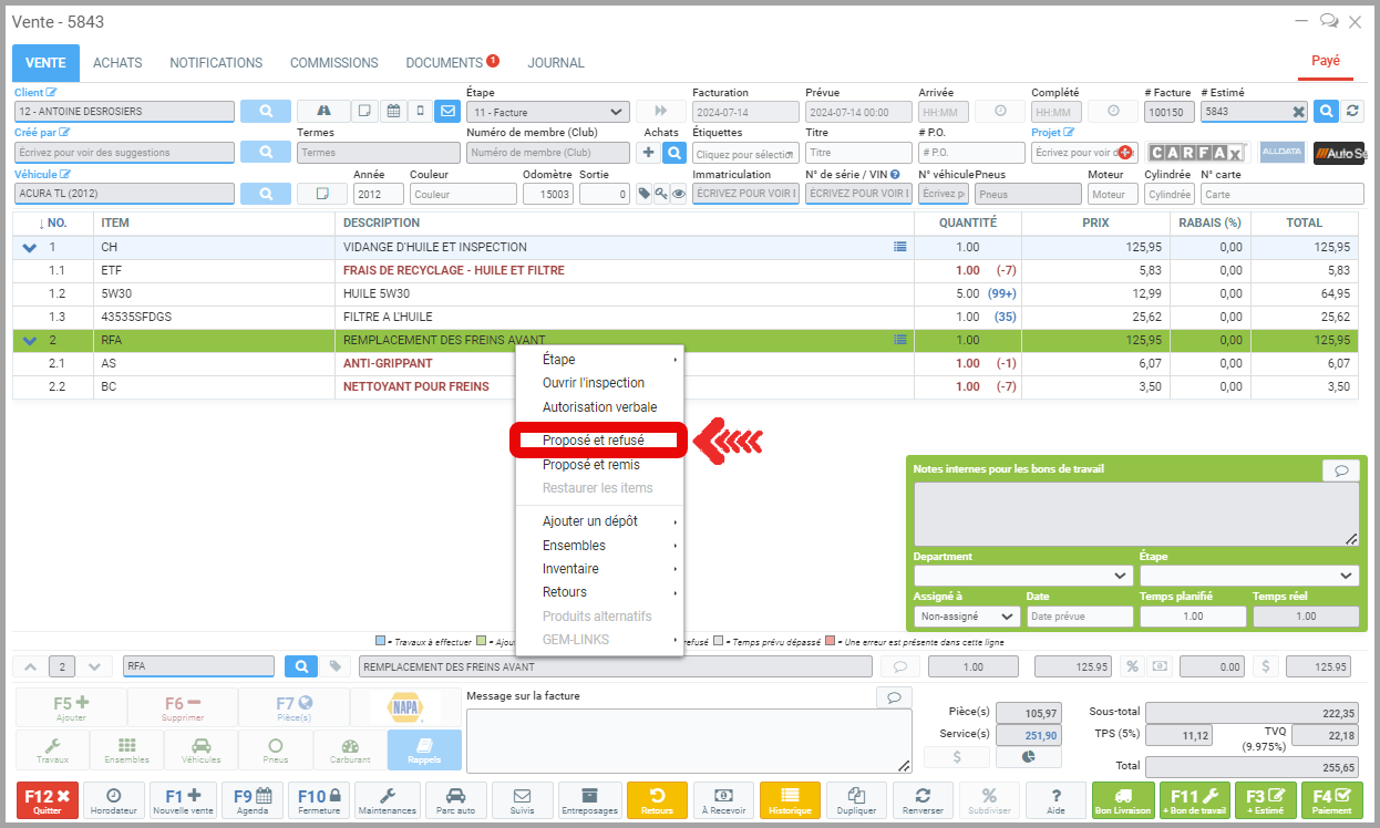 La mention Proposé et refusé apparaît maintenant sur le travail à effectuer et sur les pièces qui y sont associées. Notez également que le prix associé à ce travail est à 0$.