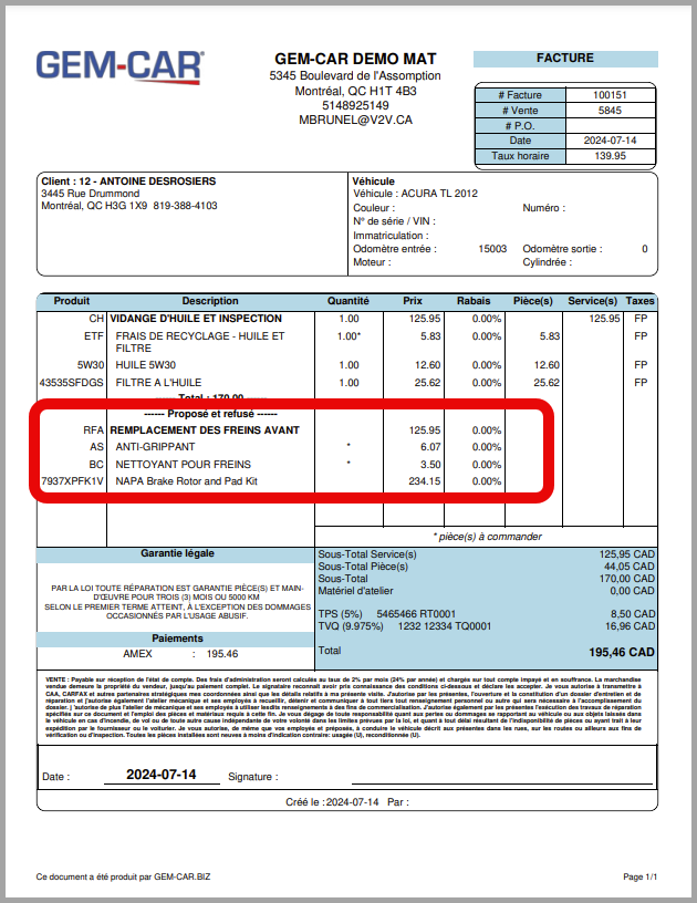 Prenons l'exemple d'un client qui se présente à la succursale pour faire un changement d'huile et une inspection de son véhicule. Le technicien constate que les freins avant du véhicule doivent être changés. Il les ajoute à l'estimé du client et lui propose d'accomplir le travail à une date ultérieure.