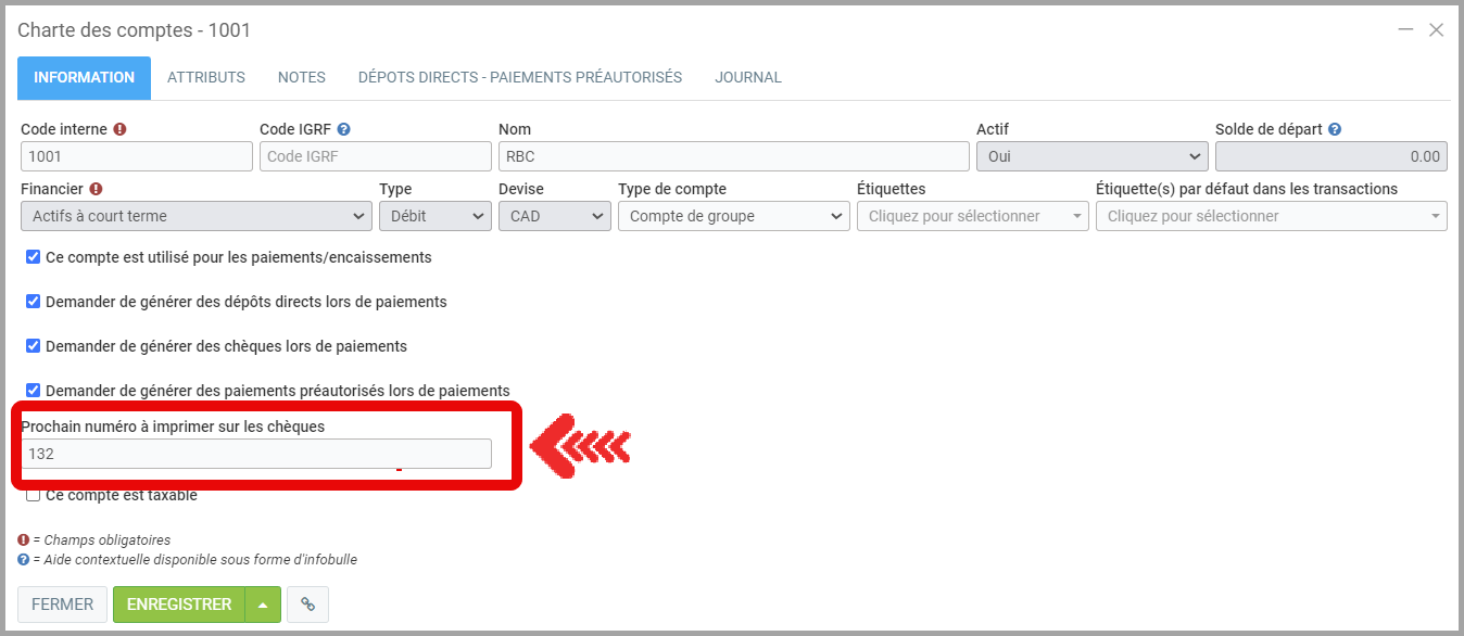 Après avoir sélectionné le compte, sous l'onglet Information, indiquez le Prochain numéro à imprimer sur les chèques.