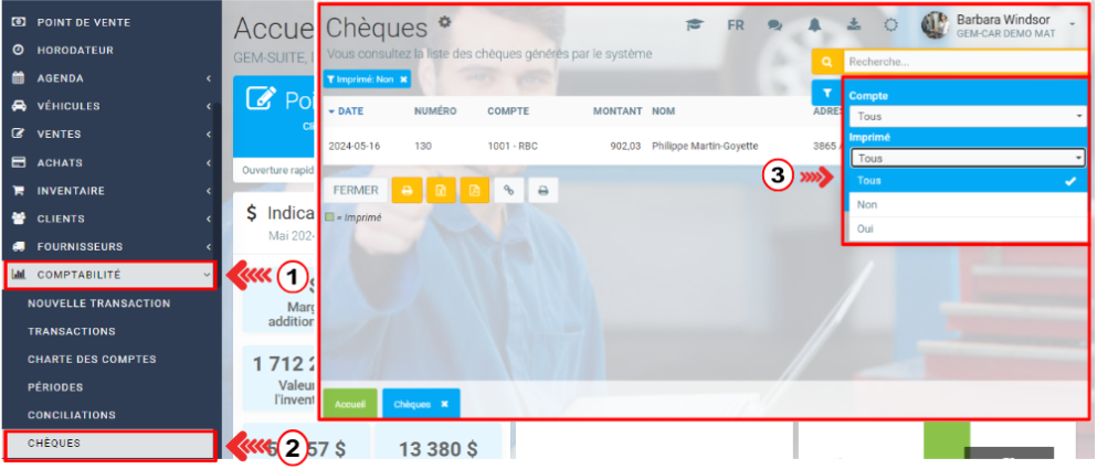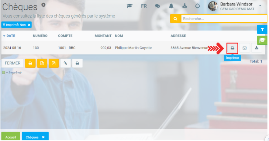 Si vous devez réimprimer un chèque, il vous suffit de cliquer sur Comptabilité > Chèques.