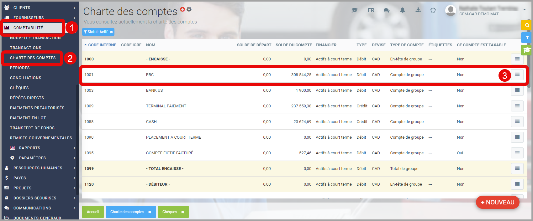 - À partir du menu principal situé à gauche de l'application, cliquez sur Comptabilité > Charte de comptes.