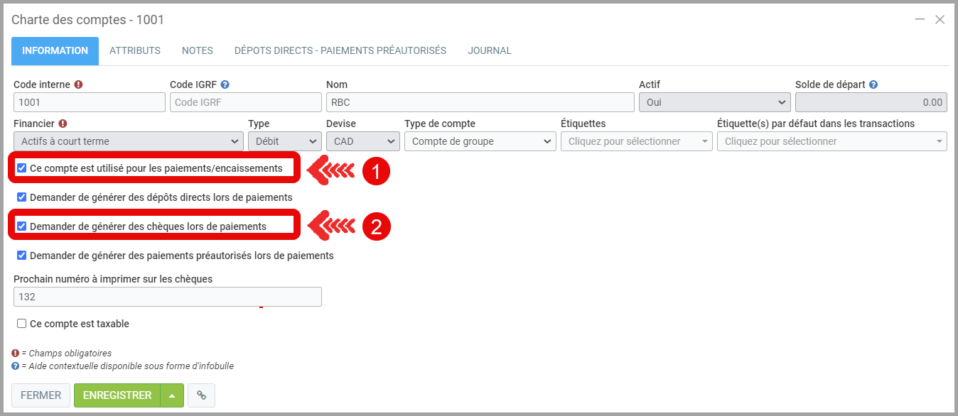 - Pour pouvoir utiliser le compte pour des paiements à partir de chèques, il est nécessaire de sélectionner les deux options suivantes: