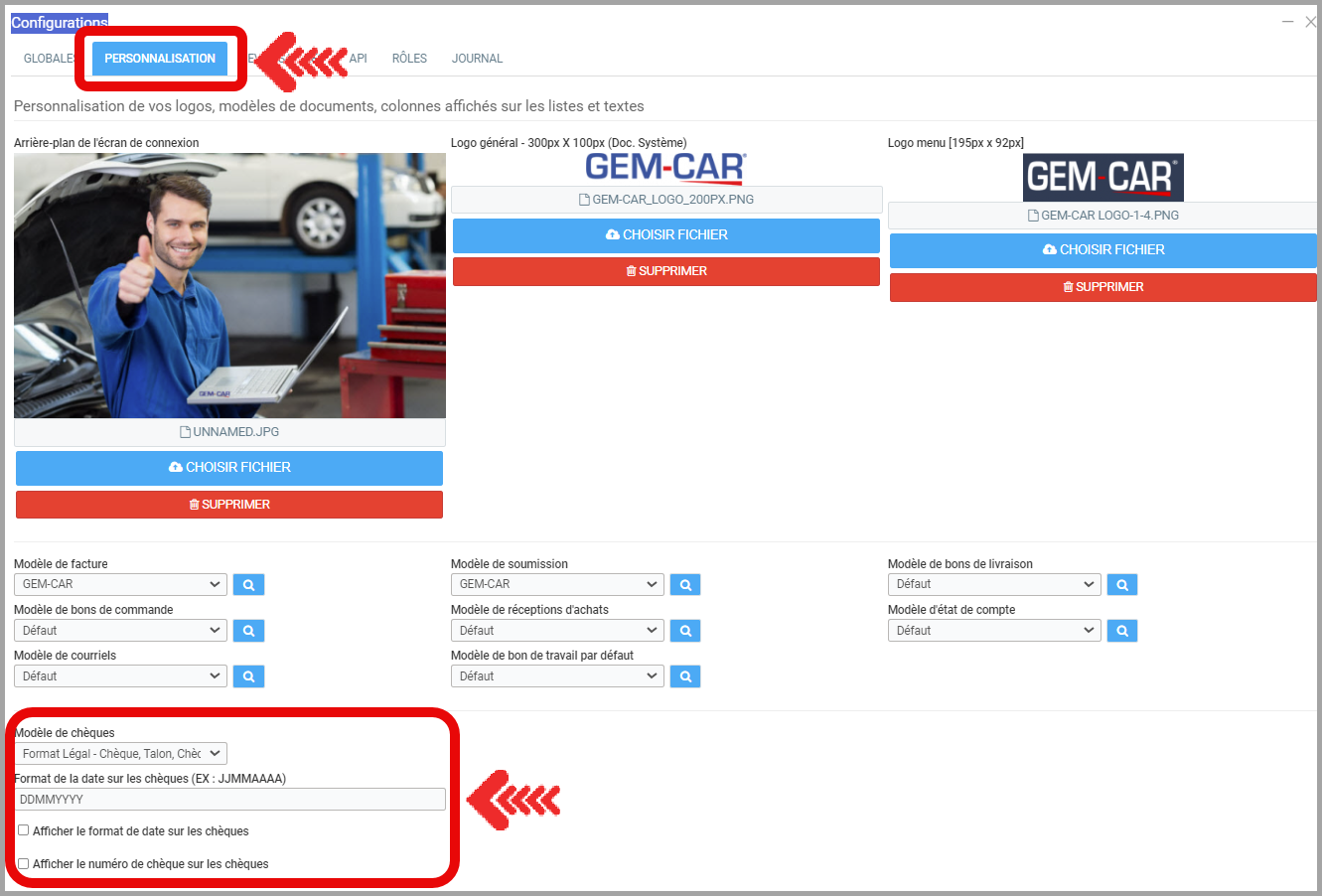 Pour personnaliser vos chèques, à partir du menu principal situé à gauche de l'application, cliquez sur Paramètres > Configurations > onglet Personnalisation.