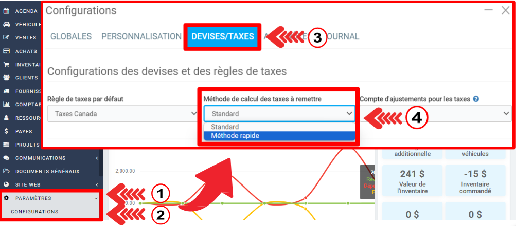 Afin d'utiliser la méthode de calcul rapide des taxes, il suffit de vous rendre dans vos paramètres.