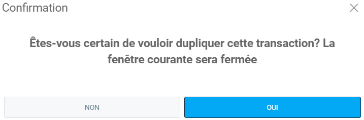 Pour dupliquer, choisissez Oui dans la boîte de confirmation avec le message suivant: "Êtes-vous certain de vouloir dupliquer cette transaction? La fenêtre courante sera fermée".