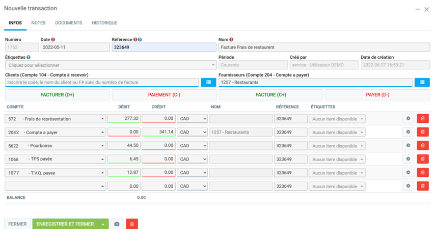 Transaction au Grand Livre - Facture de restaurant avec pourboires
