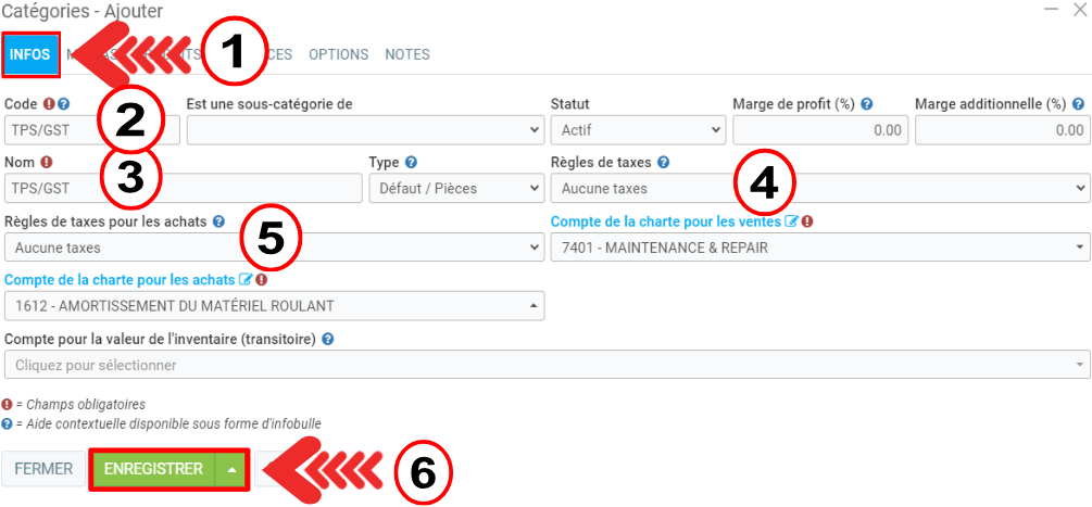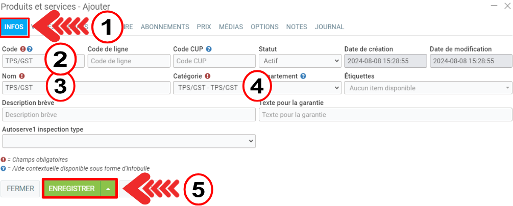 Dans l'onglet Infos, créez un produit "TPS/GST" lié à la catégorie "TPS/GST" et un autre produit "TVQ/QST" lié à la catégorie "TVQ/QST".