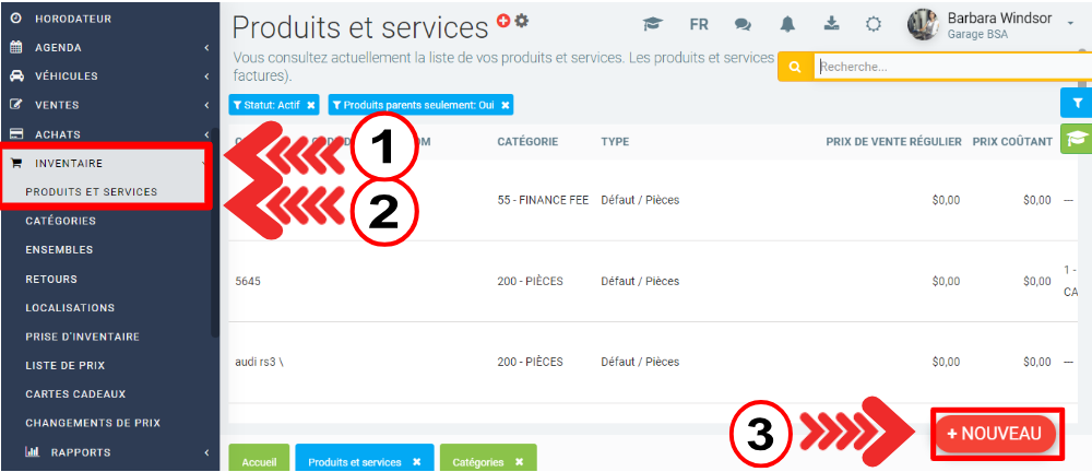 Par la suite cliquez sur Inventaire > Produits et services > +Nouveau.
