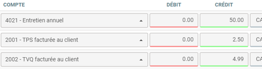 Par contre, si vous modifiez manuellement le montant des comptes de taxes, ceux-ci cesseront de se modifier automatiquement lors de la modification du compte de revenu.