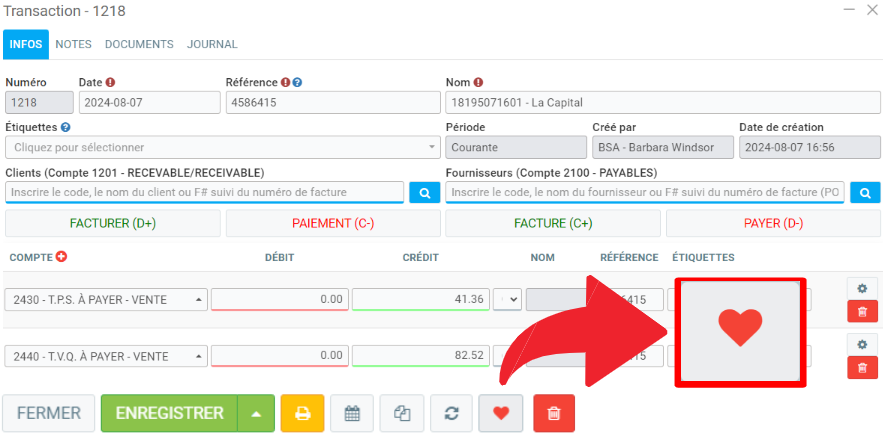 Cliquez sur le cœur rouge au bas de l'écran de la transaction en question.