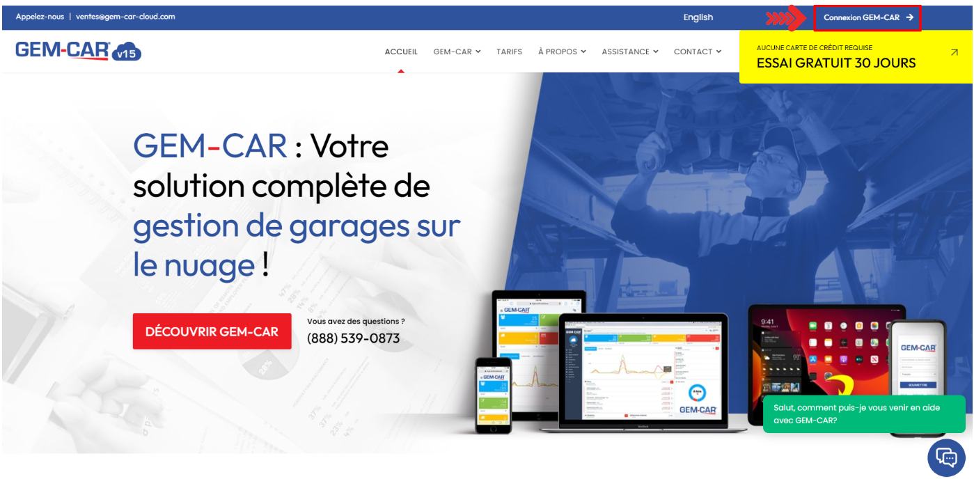 GEM-CAR est un logiciel complet auquel on peut accéder à partir d'une variété d'appareils. Vous pouvez utiliser votre ordinateur, en vous connectant via le site web https://www.gem-car-cloud.com/fr/ en cliquant sur le bouton de connexion GEM-CAR dans le coin supérieur droit. Le système peut également être utilisé sur une tablette.