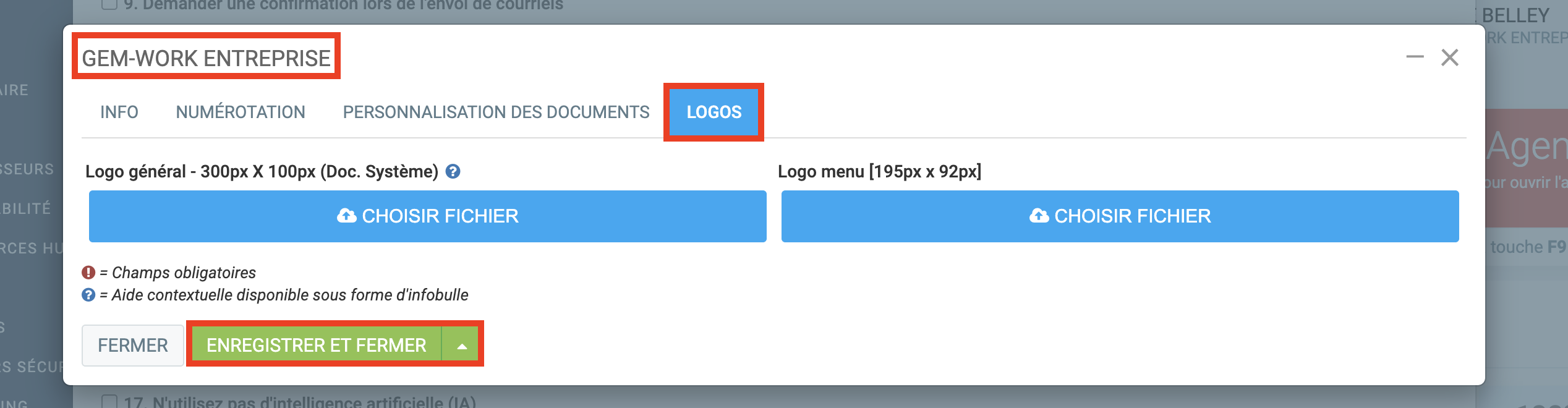 Une fois la bonne succursale sélectionnée, rendez-vous sur l'onglet Logos. Vous pourrez alors téléverser vos logos selon les conventions exigées. Une fois cette étape complétée, cliquez sur Enregistrer et fermer.