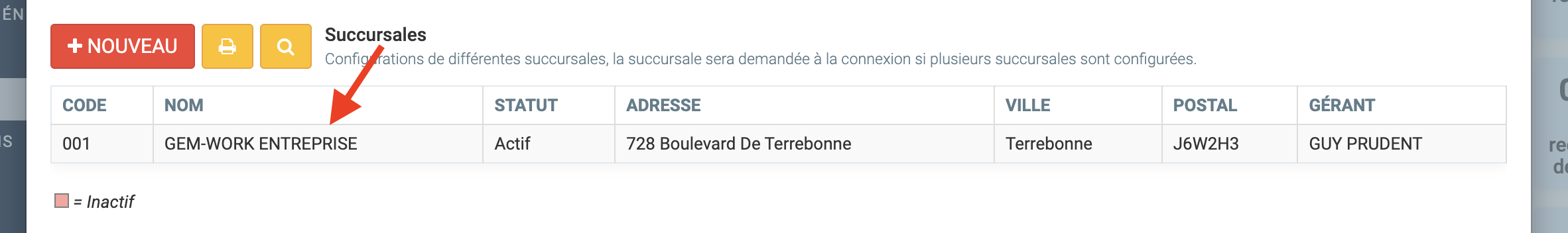 Cliquez sur la succursale désirée (dans ce cas-ci, il n'y en a qu'une, la même qui se situe dans les informations globales) :