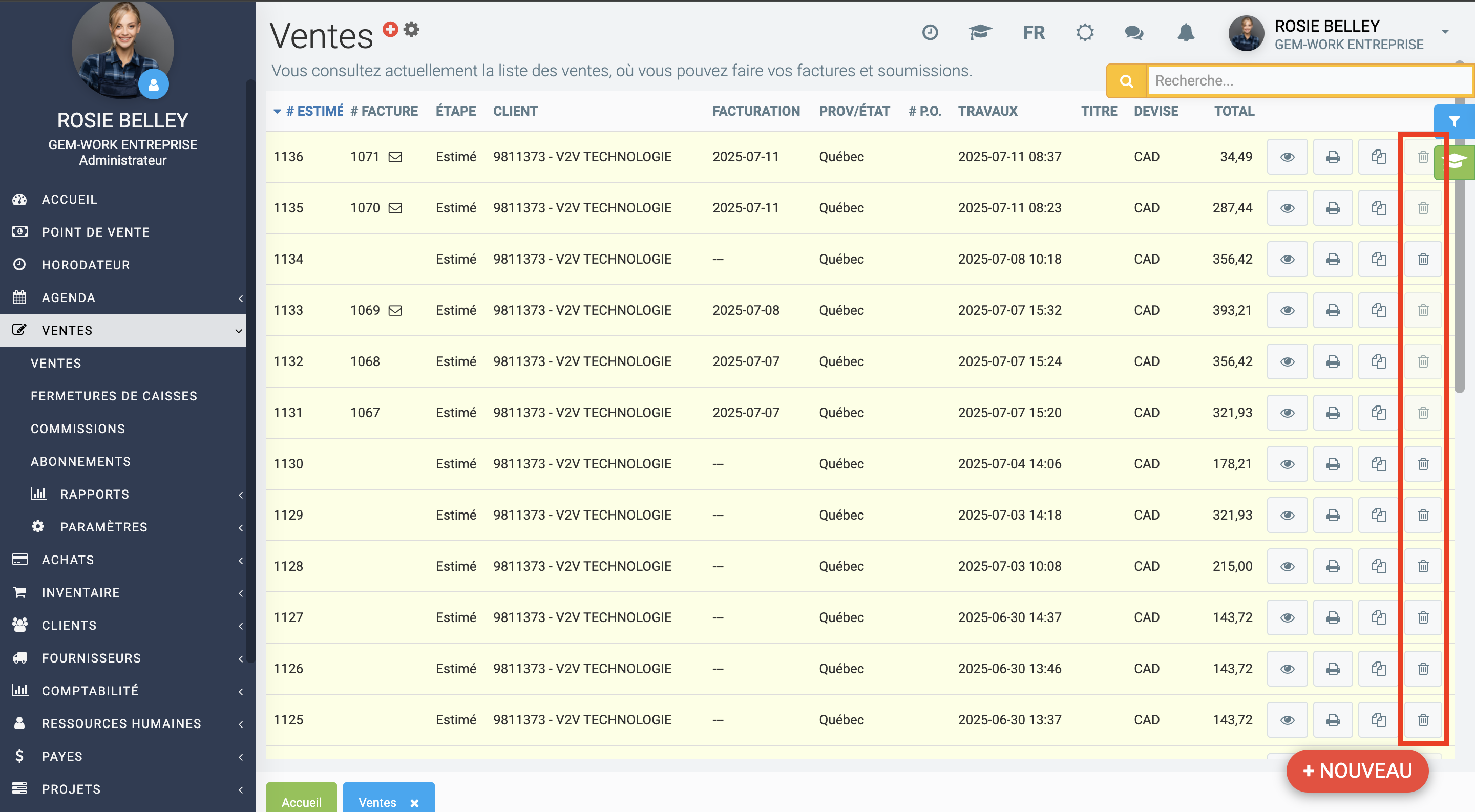 Une fois dans la page Ventes, cliquez sur la Corbeille (le bouton) associé à l'estimé que vous souhaitez supprimé. Ceci archivera et supprimera l'estimé en question.