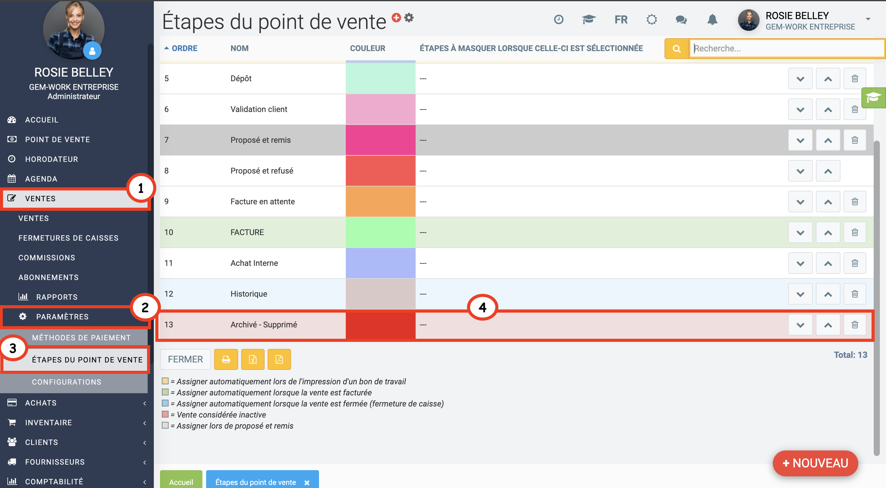 À partir du menu principal situé à gauche de l'application, cliquez sur Ventes > Paramètres > Étapes du Point de Vente > Archivé/ Supprimé.