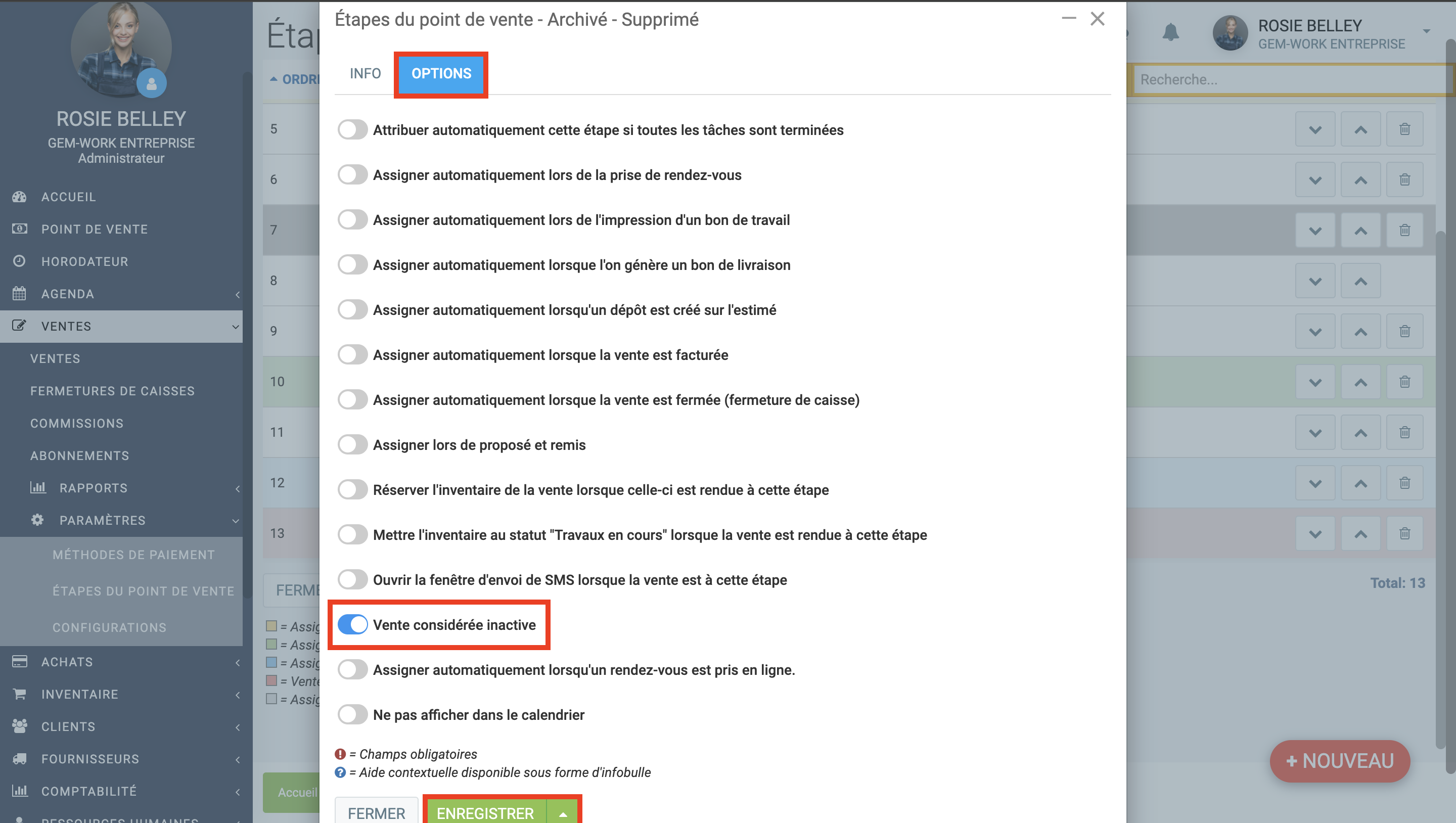 Dans la fenêtre connexe, sélectionnez l'onglet Options et cliquez sur Vente considérée inactive.