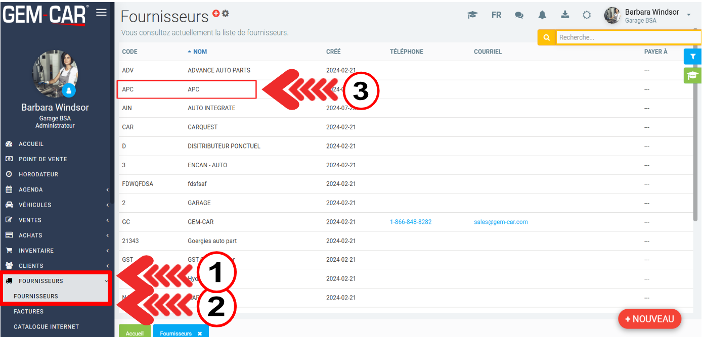 Dans le menu Fournisseurs > Fournisseurs sélectionnez le fournisseur.